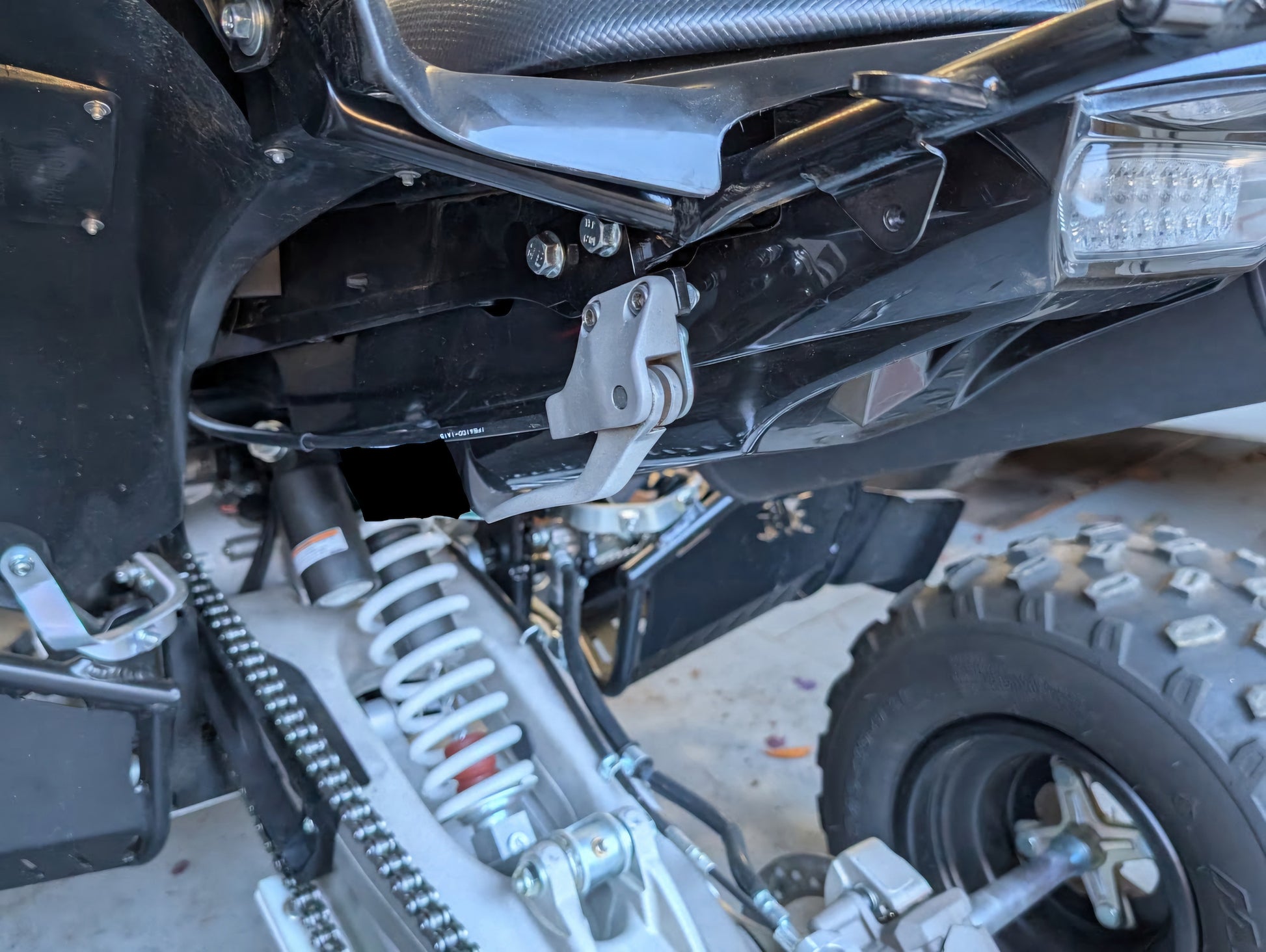 Yamaha uses the same flip-style parking brake lever on many of their sport ATVs. This lever must be removed or relocated in order to install an aftermarket clutch lever and perch. We have designed a bracket that allows for relocating the parking brake lever to the rear of the ATV where the grab bar attaches to the sub frame.